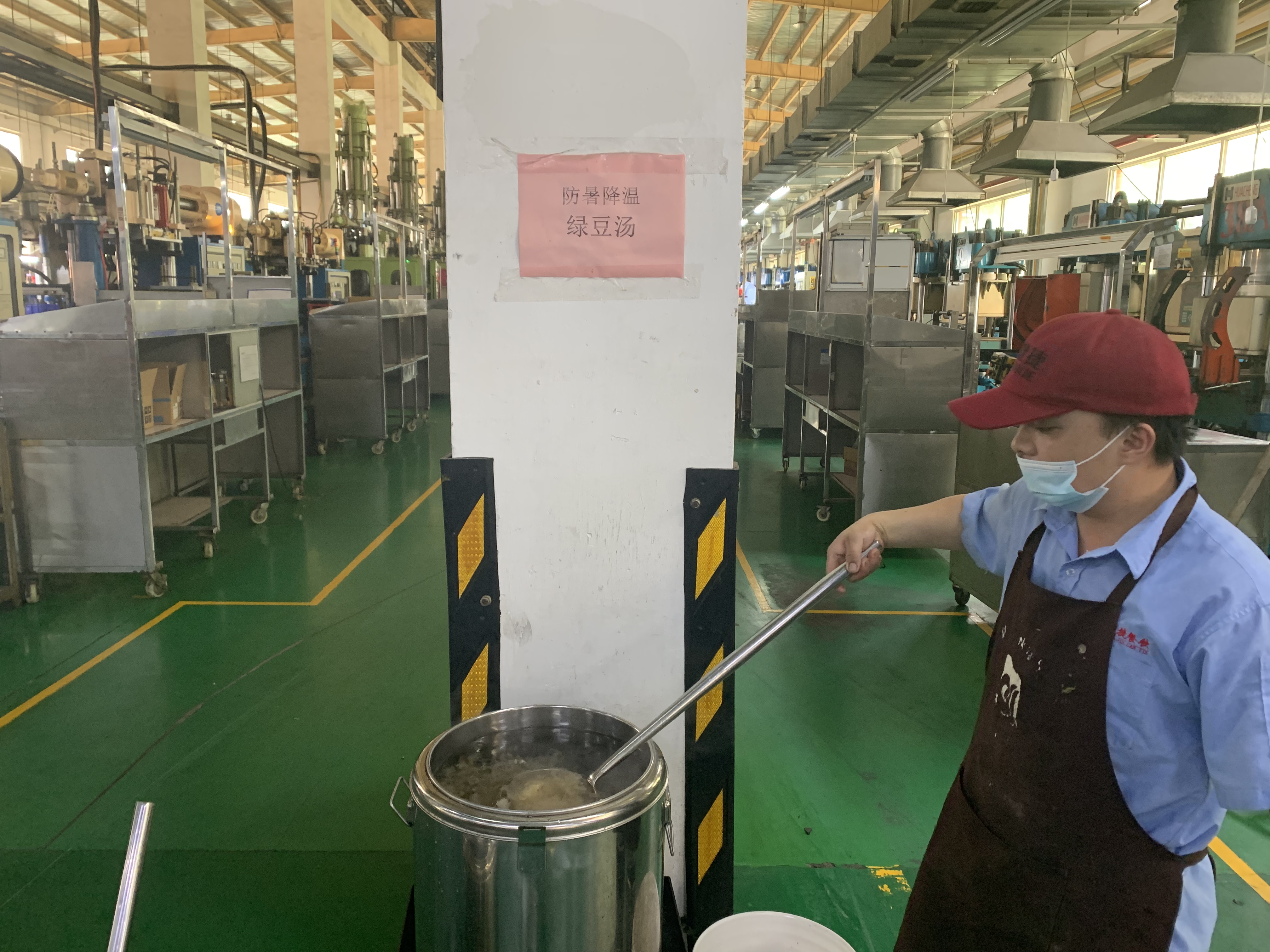 公司領(lǐng)導每年提前計劃,安排食堂每日保質(zhì)保量提供不同功能的涼茶:像銀耳羹、綠豆沙、枸杞菊花茶等供員工選擇,同時要求各部門提前請購防暑藥品備用。此外,生產(chǎn)車間各班組充分利用班前會,加大對夏季防暑降溫措施的宣傳,并宣導員工注重勞逸結(jié)合,切實做好自我防護。