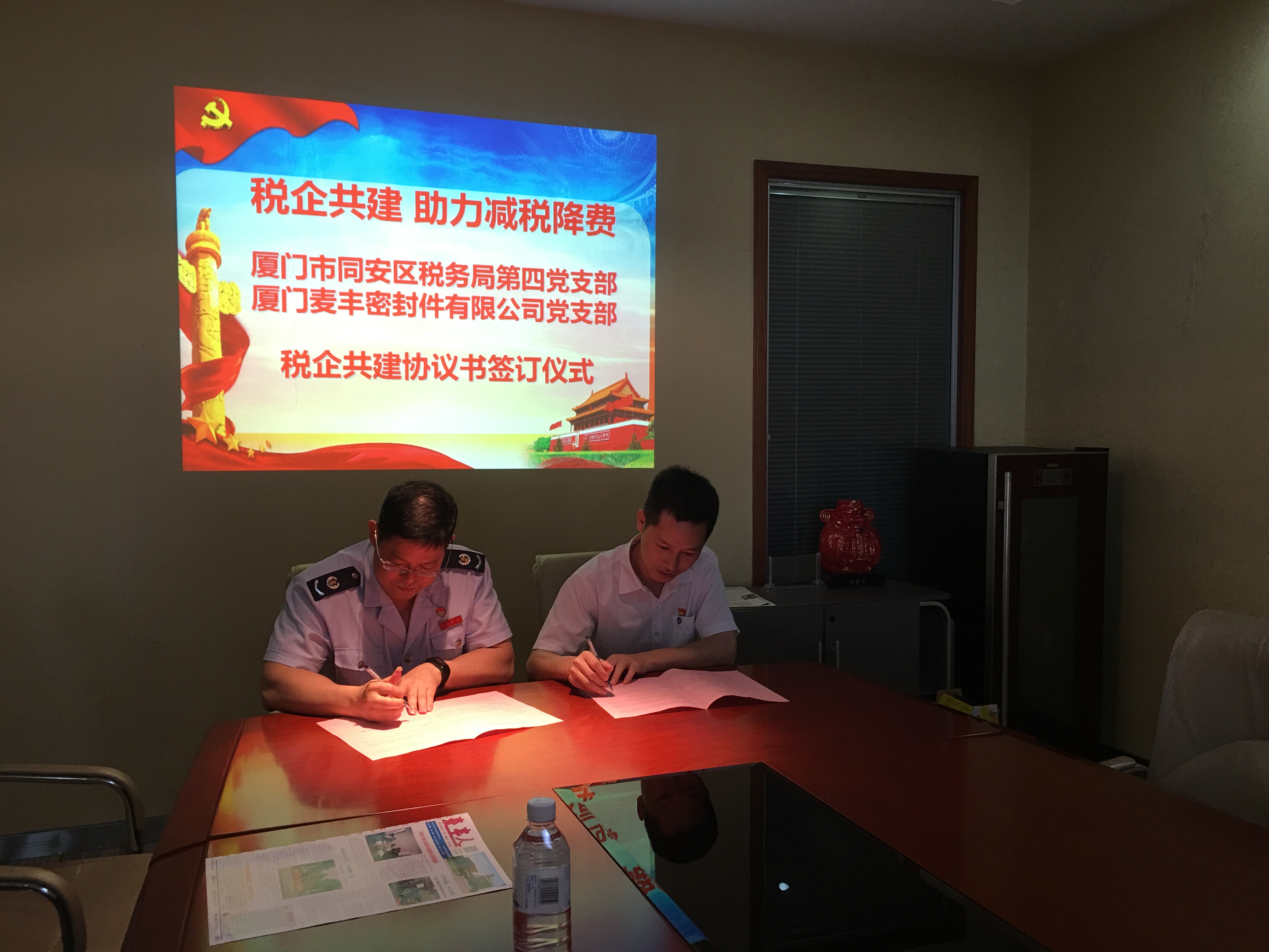 4月25日下午,廈門麥豐密封件有限公司黨支部與同安區(qū)稅務局第四黨支部進行稅企共建協(xié)議書簽訂。
