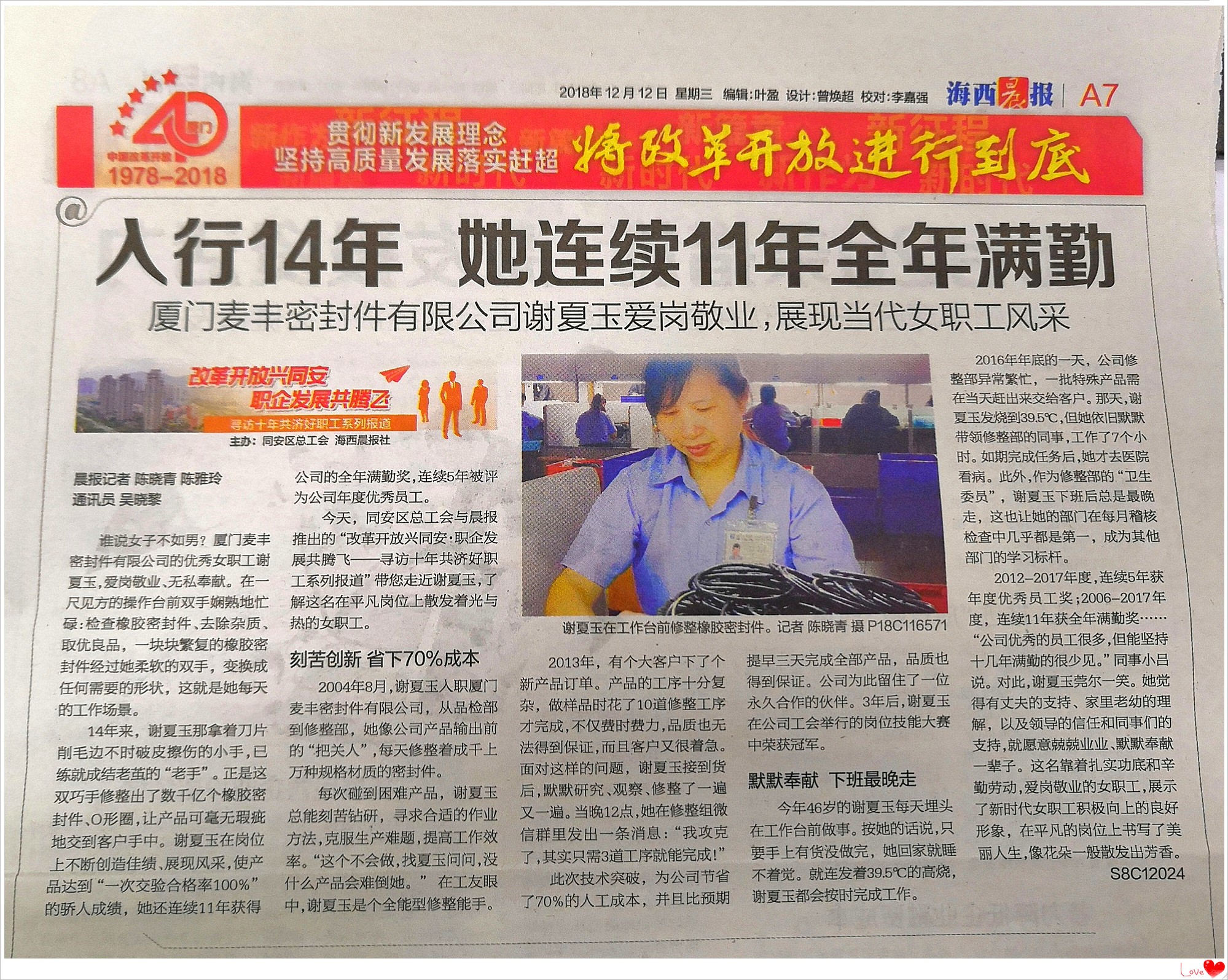 誰說女子不如男?廈門麥豐密封件有限公司的優秀女職工謝夏玉,愛崗敬業、無